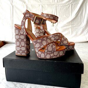 Worn once--almost new in box!! COACH's Nelly Text Platform Sandal feature the brand's signature logo jacquard print. Crisscross upper with an adjustable buckle ankle strap.