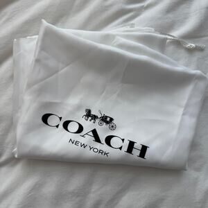 Authentic Coach New York dust bag in crisp white with the iconic black horse and carriage logo. Made of soft, lightweight fabric with a drawstring closure to protect your handbags or accessories from dust and scratches.