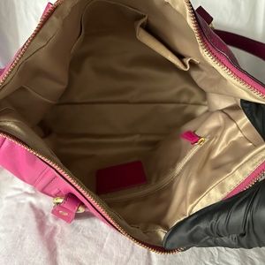 The top of this handbag has a zippered closure to keep your belongings safe. There are two interior pockets; and one zippered interior compartment. The purse is accented with gold hardware. The Coach hangtag is magenta pink leather.