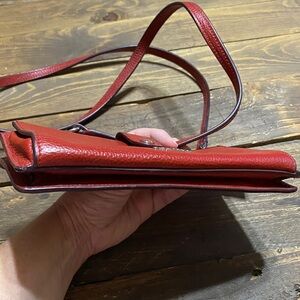 Coach Noa Pop Up Messenger Crossbody Bag in a red, pebbled leather. This versatile bag can convert from a shoulder bag to a crossbody or clutch, as its strap is detachable. It features a top zip closure, a fabric-lined interior with card slots, and a front slip pocket with snap that can hold a removable pop-out pouch