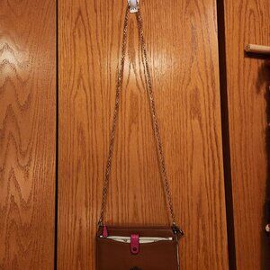 Awesome, versatile and in demand! COACH polished pebble leather crossbody convertible purse. Separate pebble leather floral zipped wallet with 4 credit card slots and full length bill compartment fits into outside pocket of main bag and is secured with snap close tab in accent color. Main bag is tan leather with floral print accent and pink zipper pull. Interior lined with fabric and has leather creed patch D2092-1366. 48" chainstrapincluded. 8.25' X 4.5" X 1.25".