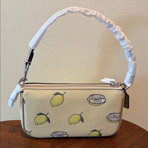 Light yellow background, brighter, yellow lemons with green leaves and some with white centers some lemons say “Coach NYC”