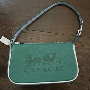 Stylish green wristlet by Coach. Features embossed logo and convenient strap.