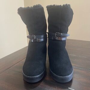 Coach Norell Suede boots. The opulent warmth of shearling backed suede meets luxury os customer hardware detail on this lavish design boot. Canceled wedge heels and thick crepe platform soles provide a bit height to this walkable, cool weather design.