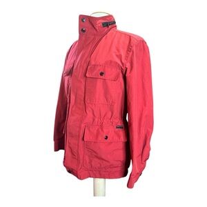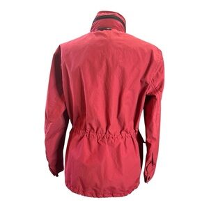Coach red light jacket. It feels like it can be water resistant but not completely waterproof. Good for spring and early fall weather. Has a waist cinch inside the jacket to tighten the waist. Has a zipper hidden under the collar that has a pocket to hide a hoodie to shade you in the rain. All the buttons are snap-on type. Has four functional pockets. Size Med No defects, holes, stains.