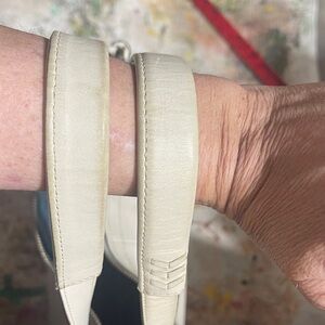 Elegant off-white leather tote by Coach. Features a stylish buckle pocket. Perfect for everyday use.