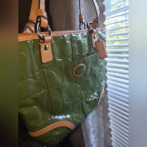 Elegant Coach tote in olive green patent leather with tan straps. Perfect for daily use. Open to offers!
