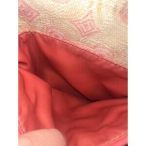 Coach Op Art Audrey Crossbody Swingpack. It is a small crossbody bag made from canvas with a signature op art pattern, and features pink leather trim and brass hardware. The model number is 45572. It measures around 7.5 inches wide by 8.5 inches high and has an adjustable crossbody strap. It is a rare and retired style.