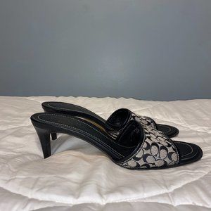 Gently used Coach leather sandals, with fabric Logo. Size 8B. Colors - black and gray.