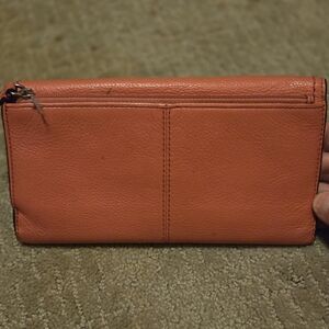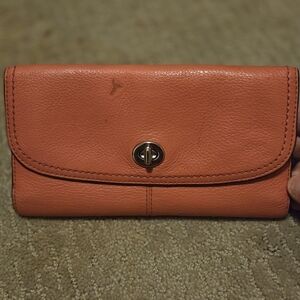 This Coach wallet in a vibrant orange hue showcases a minimalist design with smooth, high-quality leather and precise stitching. Its classic style is perfect for organizing your essentials with elegance and simplicity.