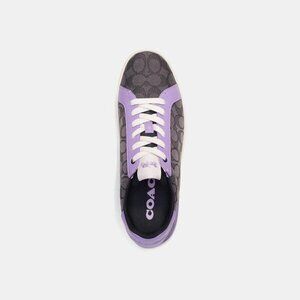Coach Outlet Clip Low Top Sneaker Men Black Leather Lace up Jacquard Signature. Signature jacquard and leather upper Fabric lining and footbed Rubber outsole Lace-up closure This Coach piece is crafted of our Signature jacquard made from a blend of organic cotton and recycled polyester Style No. CL348