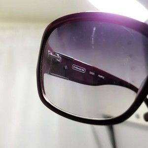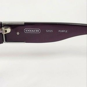 Coach S2025 is a conspicuous, sophisticated frame with a modern and trendy design. Gradient lenses on a purple frame with rhinestone embedded designer embellishment at each temple. Included is a Coach embossed large clamshell type sunglasses case, matching "C" fabric cleaning cloth and a sunglass care card. Minor flaws: Outside bottom of case has one tiny pink dot (as pictured) but otherwise in very good overall condition. Sunglasses have a shallow scratch on upper right lens that should not effect line of sight (see last photo). 57-15-125