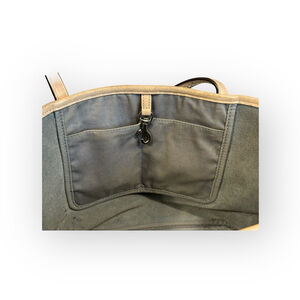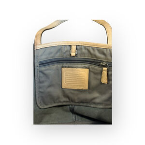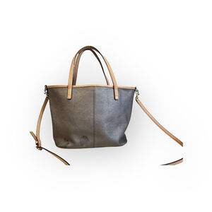 This is a pre-owned Coach tote bag, serial number F1376-F25663. The exterior is a metallic gray/pewter with tan trim and handles. It features a detachable shoulder strap and a Coach logo on the front. The interior has multiple pockets and clips. The bag measures approximately 11 inches in length. There are visible scuffs on the bottom of the bag, indicating wear. It appears as if it was scuffed please see pictures and ask questions. Interior clean. Super cute light bag