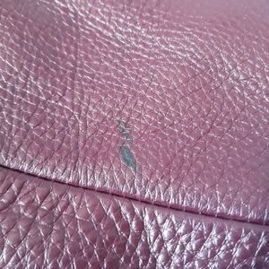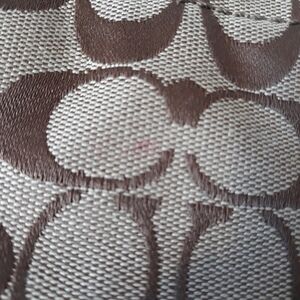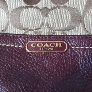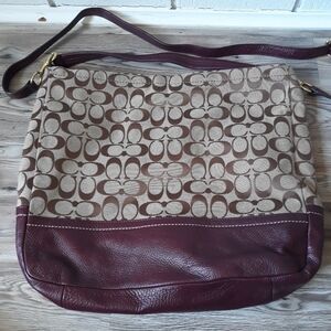 Brown signature print with burgundy leather trim and gold tone hardware. Zipper closure on top. Has shoulder strap and also crossbody strap. Inside has fabric lining. 14.75"x13"x3". Tiny pink spot on front and small black mark on the leather on the back, but otherwise good condition.