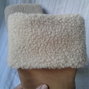 Women's Coach Parka style boots in tan, size 5. Smooth leather on the foot and heel, suede on the ankles. Sherpa cuff can be unrolled for an extra tall boot. Decorative buckle at the ankle. New without box.
