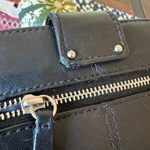 Genuine calfskin leather-buttery soft with ruching detail on front. Zipper coin pocket on back.