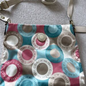 Chic Coach crossbody with pastel circle design. Features adjustable strap and signature logo accents. Super cute and has cute hand tags. #coach