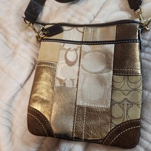 Coach signature cross body bagvl with side pocket and zippered closure. Measures width 7.5 wide and 9 inches tall with canvas strap and leather coach fob. Canvas, leatger and suede exterior. Colors of brown and metallics.