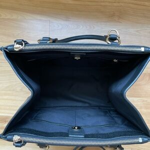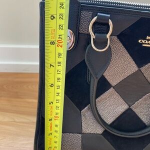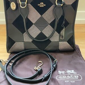 Gorgeous leather and suede patchwork handbag with gold tone hardware. Excellent condition! Rarely used with no signs of wear. Black and shades of gray/silver. Bag is very spacious. Large top opening has magnetic closure. Authentic.