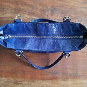 This is in excellent condition. Beautiful bright bag. The handles are in excellent condition. Silver gray interior. 15" × 9" Large open compartment.