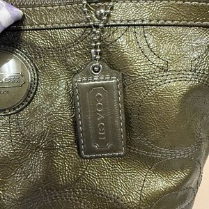 The Coach Metallic Olive Green Shoulder Bag F15142 is a stylish and versatile accessory for women. Made with luxurious leather and featuring a zip closure, this medium-sized bag in a unique olive green color is perfect for everyday use. The silver hardware adds a touch of sophistication, while the green handle/strap and bag charm accessories provide a pop of color. The beige fabric lining ensures a clean and organized interior, making this shoulder bag a must-have designer piece for any wardrobe. Imported from China, this Coach bag is a chic addition to any woman's collection.