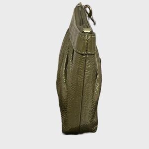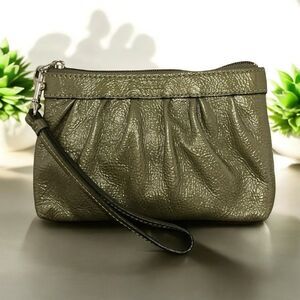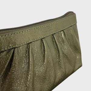 Add a pop of polished elegance to your accessories with this Coach wristlet in rich olive green patent leather. Compact yet functional, this piece is perfect for carrying your essentials—phone, cards, and keys—without the bulk. The soft pleating adds a feminine touch, while the high-shine finish keeps it modern and sophisticated.