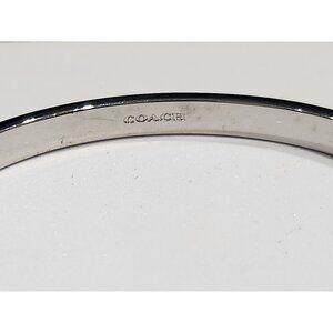Elevate your accessory game with this elegant Coach pavé crystal hinged bracelet. Crafted in a gleaming silver-tone finish, this bangle features dazzling pavé crystals along the band and a charming signature Coach horse and carriage charm, making it a perfect statement piece for any occasion. The hinged design ensures easy wear and a comfortable fit, combining style with practicality. Whether for gifting or adding a touch of luxury to your own collection, this authentic Coach bracelet embodies timeless elegance and quality craftsmanship.