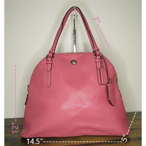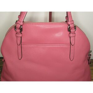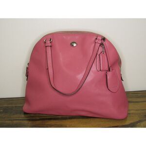 Coach leather dome satchel. Pink Strawberry hue. Saffiano leather, dual straps, two-way zip. Silver hardware. Interior: zip pocket, two slip pockets. Protective feet. Signature hangtag & COACH charm. Good pre-owned: interior stains, ink marks (pictured)..