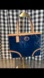 Elegant Coach tote in glossy navy. Features tan leather trim. Ideal for everyday use.