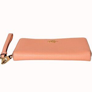 A Coach peach Saffiano leather zip-around wallet wristlet with gold hardware and detachable wrist strap.