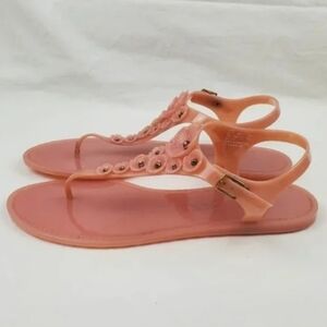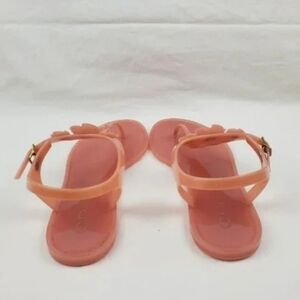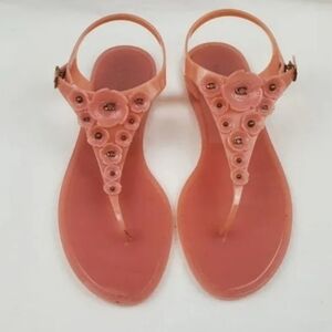Elegant peach sandals with floral details. Ideal for warm weather outings.Coach multi flower jelly thong sandals
