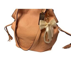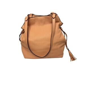 Elevate your everyday look with this authentic Coach Pebble Leather Drawstring Tote. Crafted from genuine pebbled leather in a pink salmon, this tote is both stylish and functional. It features a spacious open interior with zip and slip pockets, a secure magnetic snap closure, and drawstring side details with tassel accents. Perfect for work, travel, or casual wear, this versatile tote adds classic Coach sophistication to any outfit.