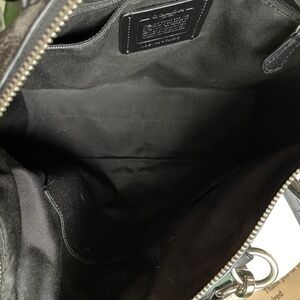 Coach shoulder bag in soft, high-quality black pebbled leather with chrome hardware. Like new condition – no nicks, scrapes, or defects. Measurements: 13" x 8.5" x 2.5". Detachable and adjustable long strap with 22" drop for shoulder or crossbody wear. Inside zip pocket on one side and two pouch pockets on the other.