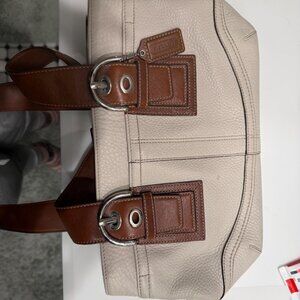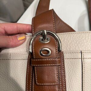 Beautiful Coach leather shoulder bag in a timeless ivory pebbled leather with rich brown leather straps and trim. Features Coach’s signature buckle hardware and clean, classic lines that work for everyday wear or work.