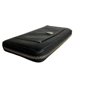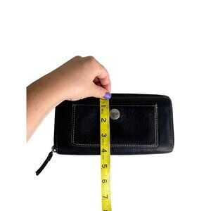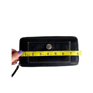 This Coach pebbled leather zip-around long wallet in black features multiple card slots, a coin zip compartment, and a sleek, timeless design. It’s in good pre-owned condition with moderate signs of wear, making it a stylish and practical everyday essential.