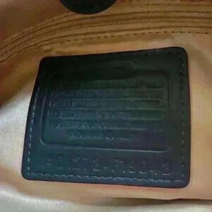 Made of Coach Water resistant signature sateen fabric with navy patent leather double handles and trim.