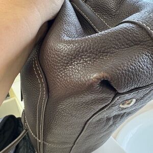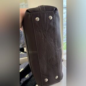 Discover the perfect blend of style and functionality with this chic dark brown leather satchel. Its sophisticated design makes it an ideal accessory for any outfit. This is a pre-owned bag in good condition that has plenty of life left. This bag has a few places that are worn on the corners and a few minor stains inside the bag. See pictures for details. Height 9.5” and width 13”.