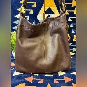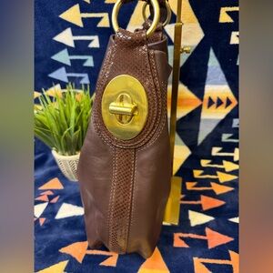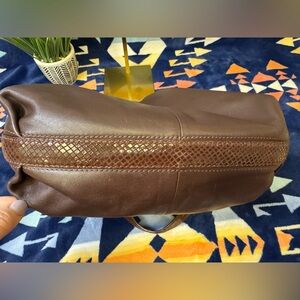 EUC beautiful chocolate brown leather with snakeskin straps and gold tone accents.
