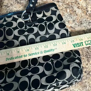 This Coach Penelope Signature C shoulder bag is a stylish addition to any outfit. The black canvas and leather exterior with buckle and strap accents make it a perfect choice for travel, casual outings, and business meetings. The bag has a medium size, with a width that can be seen in the pictures, and a height that is also in the pictures. The bag features double handles with a 8" drop, and a magnetic and snap closure.