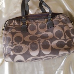 EEUC. Outline signature sateen fabric with metallic leather trim. Zipper top closure. Front flap pocket with snap closure. Fabric lining. Inside zip pocket. 2 slide pockets. Coach hangtag. Handles with 6-1/4" drop.
