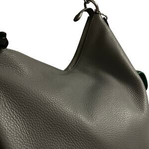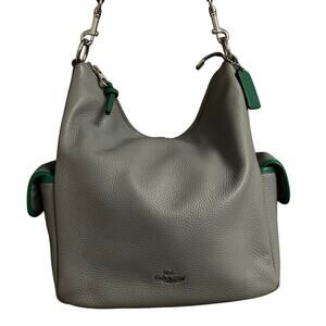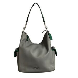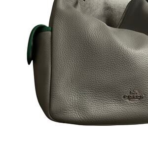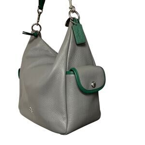 • Features: Comes with attachable and adjustable strap, Gray pebbled leather with green trim, handles, and straps, Silver toned hardware, Main compartment zip up closure, Side flap pockets, Back exterior zipper pocket, Multiple interior compartments, Pennie Shoulder Bag by Coach