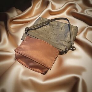 Chic Coach wristlet featuring a stylish perforated pattern. Ideal for adding elegance to any outfit.