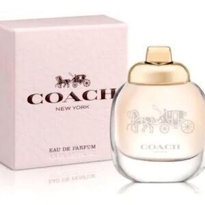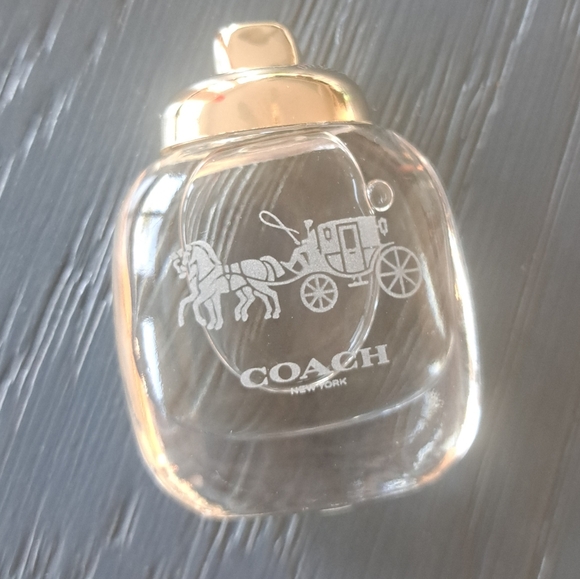 Glass bottle with gold cap, sprinkle or dab on. Features Coach logo and horse-drawn carriage design. Smells so good, makes a great little gift, good for travel. Top notes of raspberry leaf, pear, pink pepper. Mid notes of gardenia, Turkish rose. Base of suede, musk, cashmeran, sandlewood. NIB. Genuine Coach.