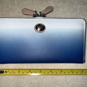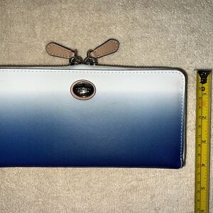 Royal blue Ombre smooth coated canvas; 1 exterior slip pocket; Chalk White Interior; 5 bill size slip pockets; 12 card slots; 1 bill length zipper pocket; Dual Zipper Closure with Beachwood Leather pulls; 8" x 4" x .75" Silver Hardware