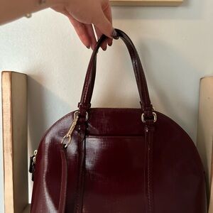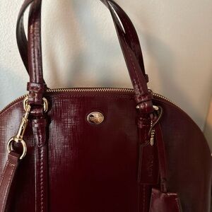 Sophisticated Coach shoulder bag in deep burgundy leather. Features elegant design and premium quality. It also comes with a crossbody strap!