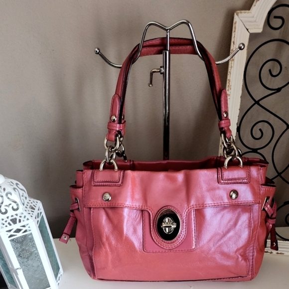 This stylish pink leather handbag is perfect for any occasion. Its elegant design and durable material make it a must-have accessory.Coach Peyton CARRYALL metallic pink GUC although there are signs of wear this is still really beautiful