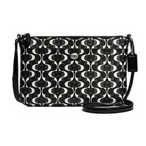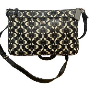 Super cute and trendy crossbody, coated canvas and patent leather, messenger style, adjustable straps, fun colors and signature logo