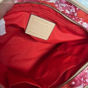 This Coach tote bag features a striking red and white floral design, perfect for adding a pop of color to any ensemble. Crafted with durable materials, it offers both style and functionality for everyday use. The structured shape ensures it maintains its form, making it a reliable and fashionable accessory. See all photos as they are part of description