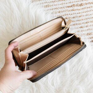 Coach Peyton wallet, Coach zip around wallet, Coach brown logo wallet, Coach signature C wallet, women’s designer wallet, leather trim wallet, Coach accordion wallet, Coach long wallet, luxury zip wallet