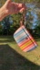 Striped canvas with leather trim in a multicolor pattern.Zip-top closure with fabric lining. Strap with a clip that can be used as a wrist strap or attached to the inside of a larger bag.